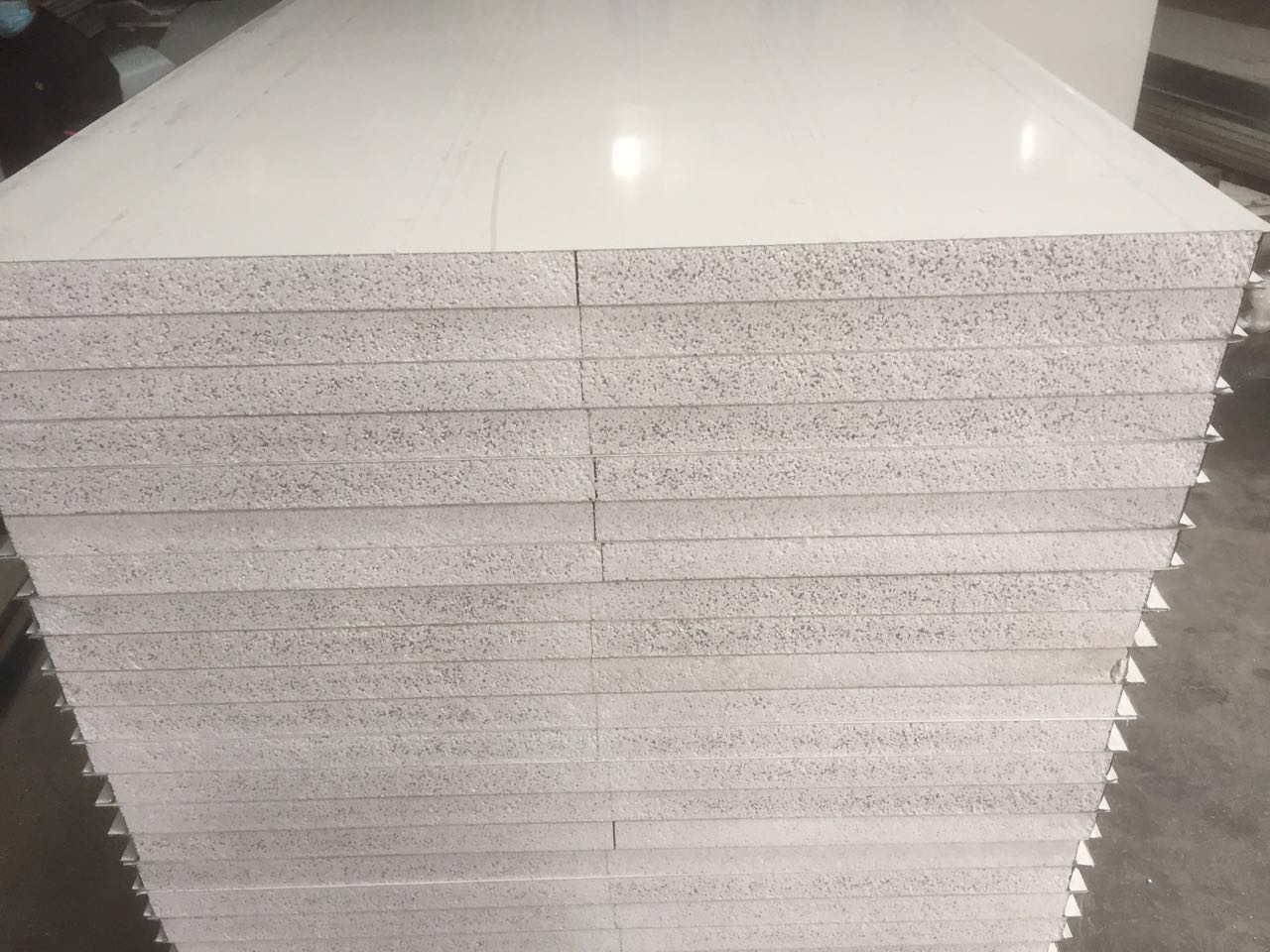 該彩鋼板產(chǎn)品芯材與彩涂鋼板面均采用PAPU單組份聚氨酯強(qiáng)力粘結(jié)劑,該液膠固化后,粘結(jié)強(qiáng)度極強(qiáng),在高溫中不會(huì)熔化滴落,固化膠層無(wú)毒無(wú)味,符合ISO或IMO有關(guān)標(biāo)準(zhǔn)的要求。