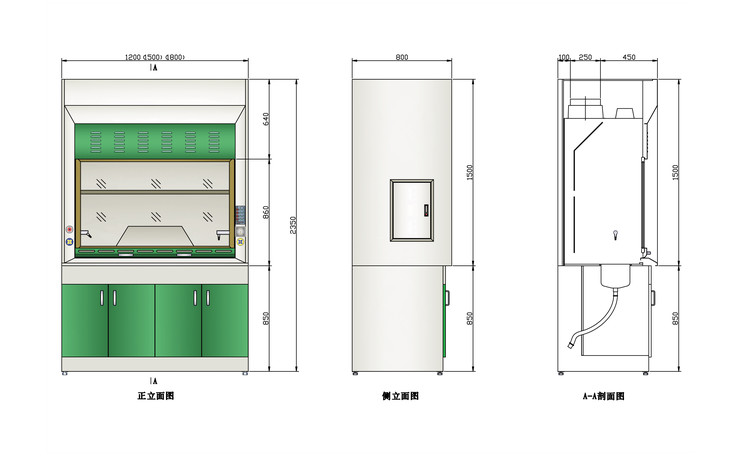 前方中間為可上下移動(dòng)的透明門(mén)(多為玻璃),開(kāi)啟高度一般為100-600毫米。門(mén)后為實(shí)驗(yàn)進(jìn)行的工作面,有水管、下水道、電源、真空泵、氣路管線等實(shí)驗(yàn)需要的連接,上有帶保護(hù)罩的燈照明。空氣由柜內(nèi)前上方的排風(fēng)扇抽走后,或經(jīng)管道引到別處(稱(chēng)為全通風(fēng)),或經(jīng)過(guò)濾重新循環(huán)使用(成為無(wú)管通風(fēng))。