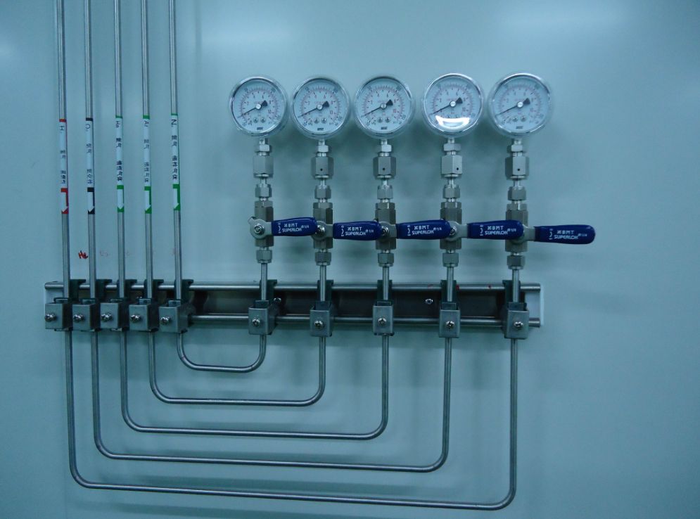 實(shí)驗(yàn)室氣體管道工程氣瓶區(qū)域用管路引進(jìn)。實(shí)驗(yàn)室氣體管路主要材質(zhì)為不銹鋼,安裝在天花板下方,沿著墻走,這樣便于檢查和維修。安裝半自動(dòng)轉(zhuǎn)換閥控制氣瓶更換,主要的控制閥門和減壓閥門都安裝在實(shí)驗(yàn)室外。除了儀器空氣(工廠空氣)是工廠直接生產(chǎn)外,其余氣體都是采用高壓氣瓶柜供氣。