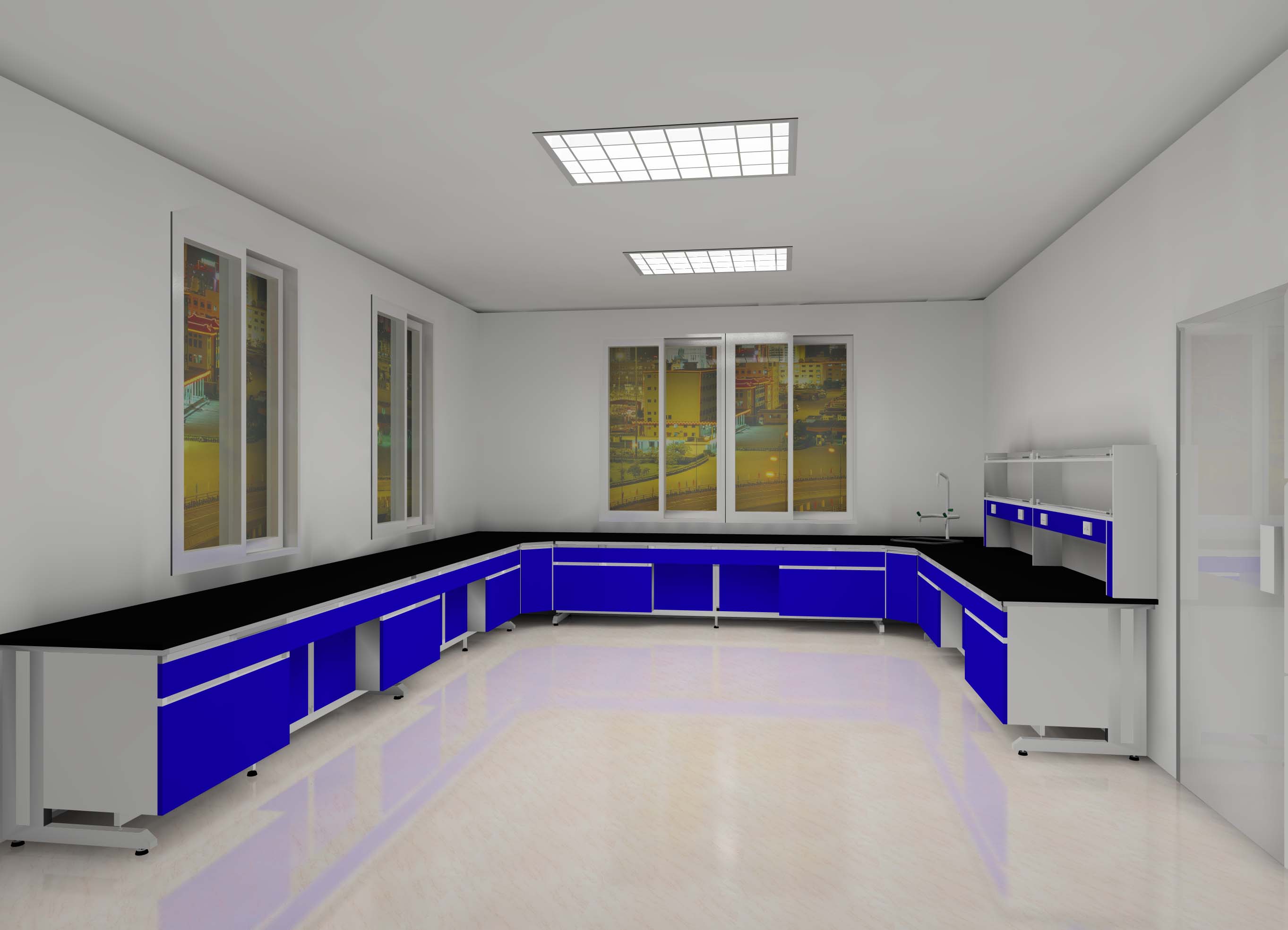 常用實驗室門寬為900~1500mm,并設有一個安全門,內(nèi)部操作流程要求順暢,防止發(fā)生危急情況時,出現(xiàn)通道堵塞現(xiàn)象,設計時常用島型、半島型、L字型、U字型等實驗室布局方案。主通道、兩個中央臺雙面操作,間距大于1500mm,邊臺單向距離大于1200。排毒柜雙面操作距離大于1500mm。